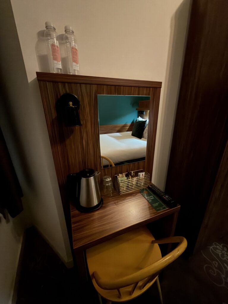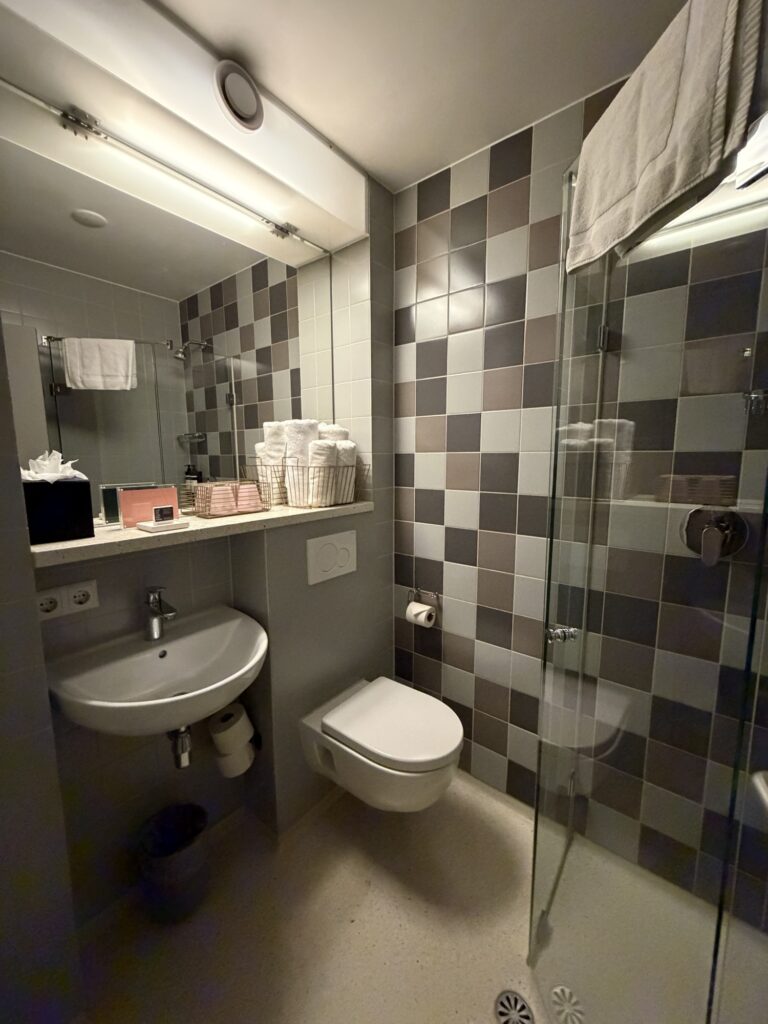 Beim Öffnen der Tür unseres 11 Quadratmeter kleinen Zimmers der Kategorie Small Double war sofort klar: Man sollte sich schon gern haben, wenn man zu zweit hier übernachtet – und darf nicht klaustrophob sein. Dass Hotelzimmer in Amsterdam tendenziell klein sind, war uns bewusst. Das ist also kein Problem. Vor allem im Linden Hotel nicht, denn hier macht man keinen Hehl daraus, lautet das Motto doch #tinyliving. Und in unserem Doppelzimmer wurde jeder Zentimeter optimal genutzt. Dadurch war neben dem schmalen Doppelbett sogar noch Platz für einen Schreibtisch mit Sessel, Wasserkocher, Garderobe, Kasten, Hocker und Regal. Erfreulich, wenn es in einem kleinen Zimmer viel Stauraum und Sitzmöglichkeiten abseits des Bettes gibt. Denn wenn ich eines nicht mag, ist es mit Straßenkleidung auf dem Bett sitzen. Zum Zimmer gehörte auch ein privates Bad mit WC, viel Ablagefläche und einer Dusche. Für die Dusche sollte man allerdings nicht zu korpulent sein und nachdem die Duschtür nicht mit dem Boden abschließt, damit rechnen, dass der Boden im Raum nass wird. Ein weiterer Haken zum Aufhängen der nassen Handtücher wäre wünschenswert, ansonsten gab es hier aber nichts zu meckern.